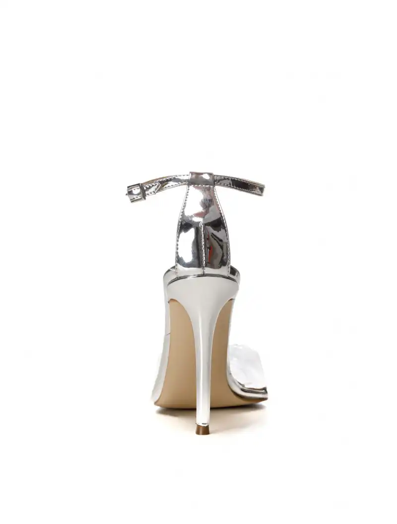 Sandale transparente cu toc și talpă îmbrăcate în piele naturală argintie. Au un design simplu și nonconformist, vârf decupat și ascuțit, fiind extrem de ușor de asortat la orice ținută de seară.